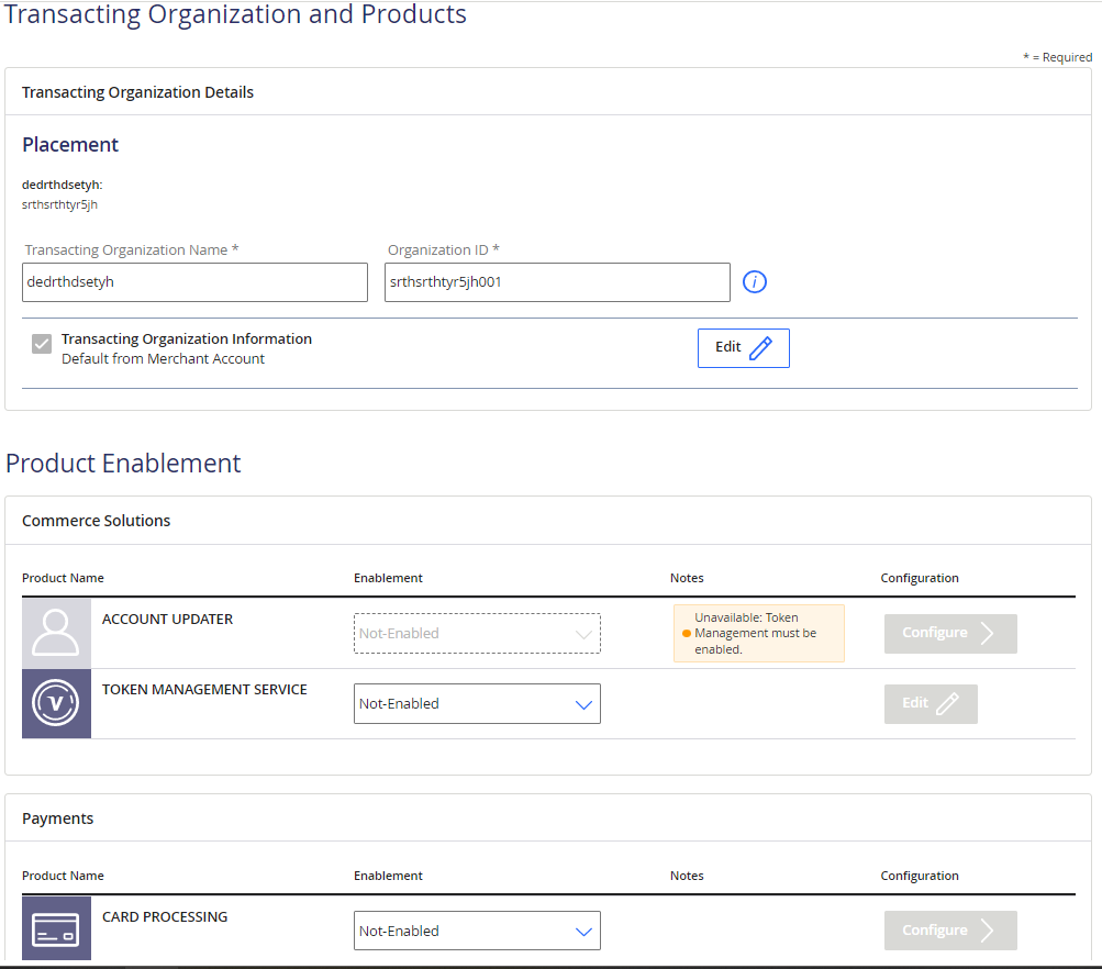 - Optional: modify the name and ID of the organization by using the text fields in the Transacting Organization Details section. The ID must be unique, not just in the portfolio or account, but across the system. By default, the name is the merchant name with 001 added to the end of the name. If you accept this default, additional transacting organizations will have default names that iterate the numbers at the end of their names, beginning with 002.