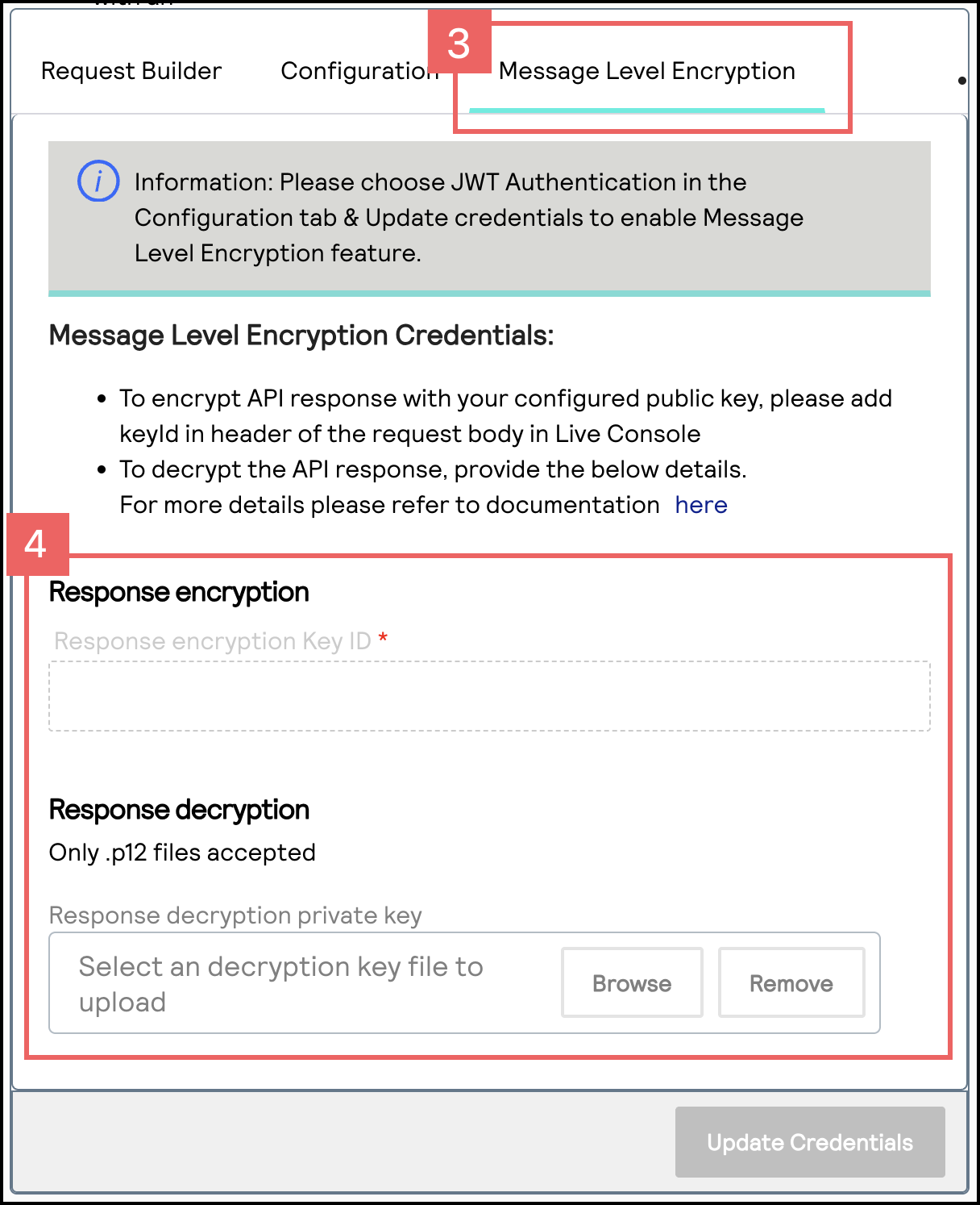 - Enter your API response MLE key credentials in the Message Level Encryption Credentials section: