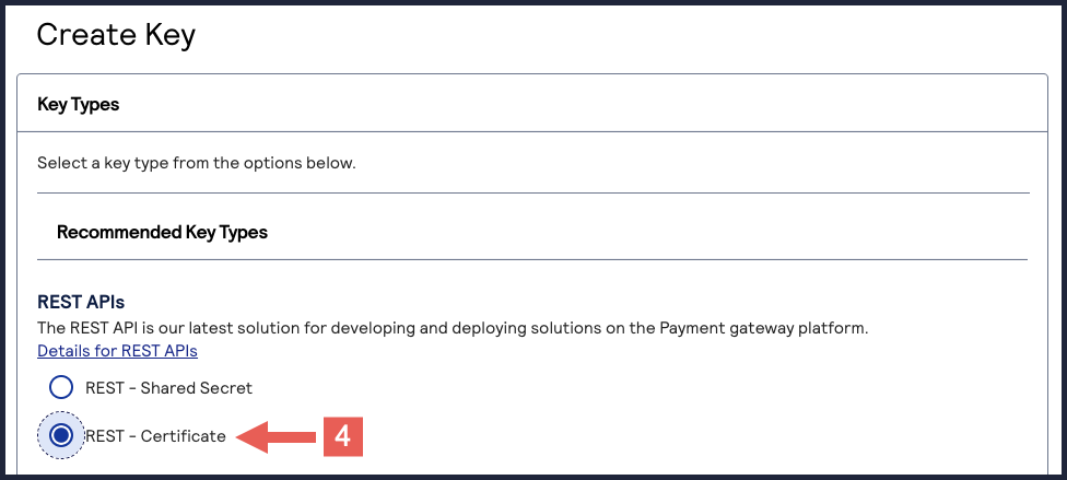 - Under REST APIs, chooseREST – Certificate, and then clickGenerate key.If you are using aportfolioaccount, the Key options window appears, giving you the choice to create a meta key.For more information about how to create a meta key, see .