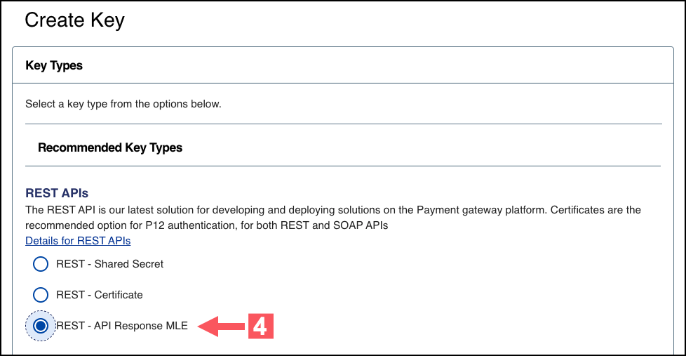 - Under REST APIs, chooseREST – API Response MLE, and then clickGenerate key.